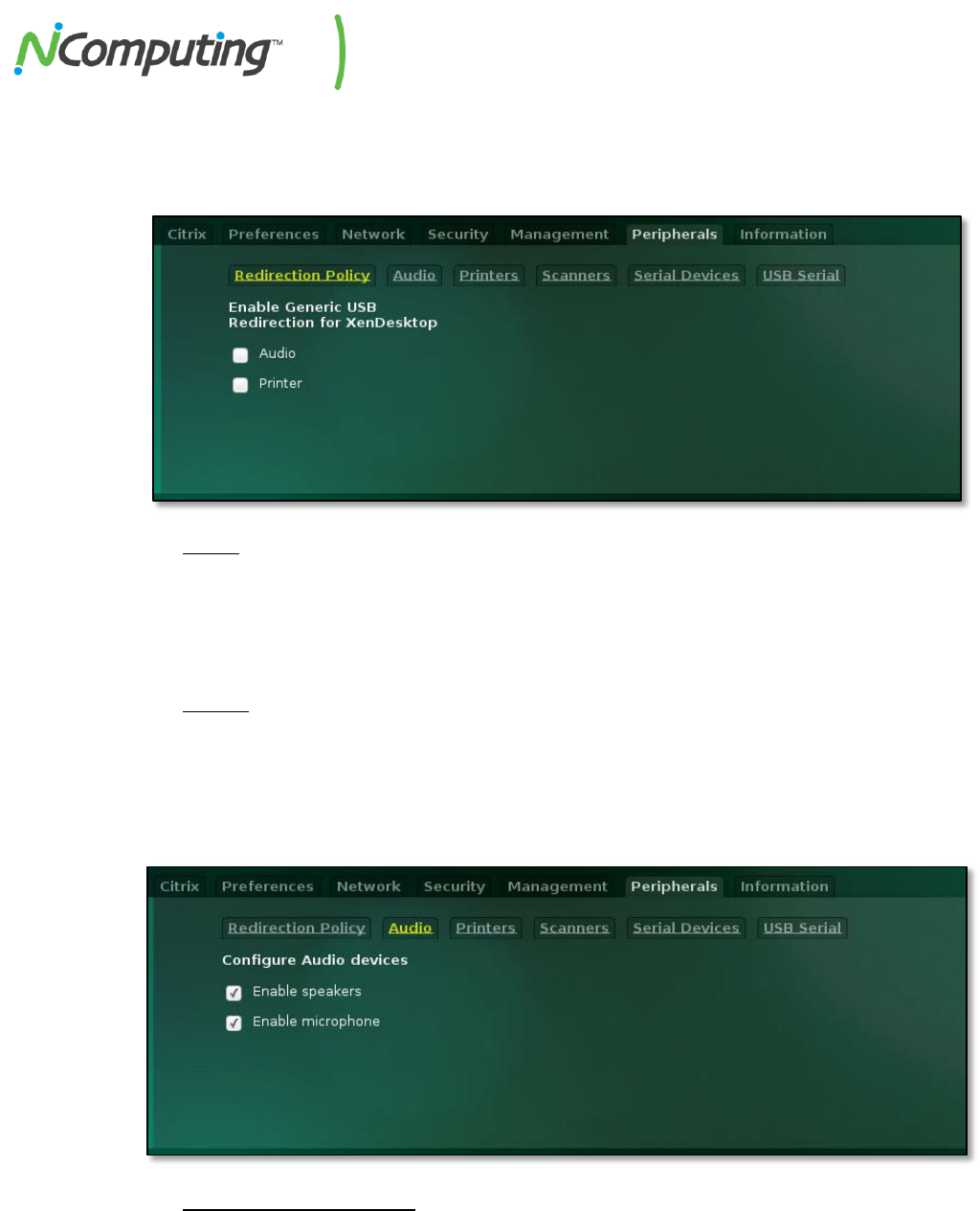 The Redirection Policy section of the Peripherals Tab allows administrators to enable and disable