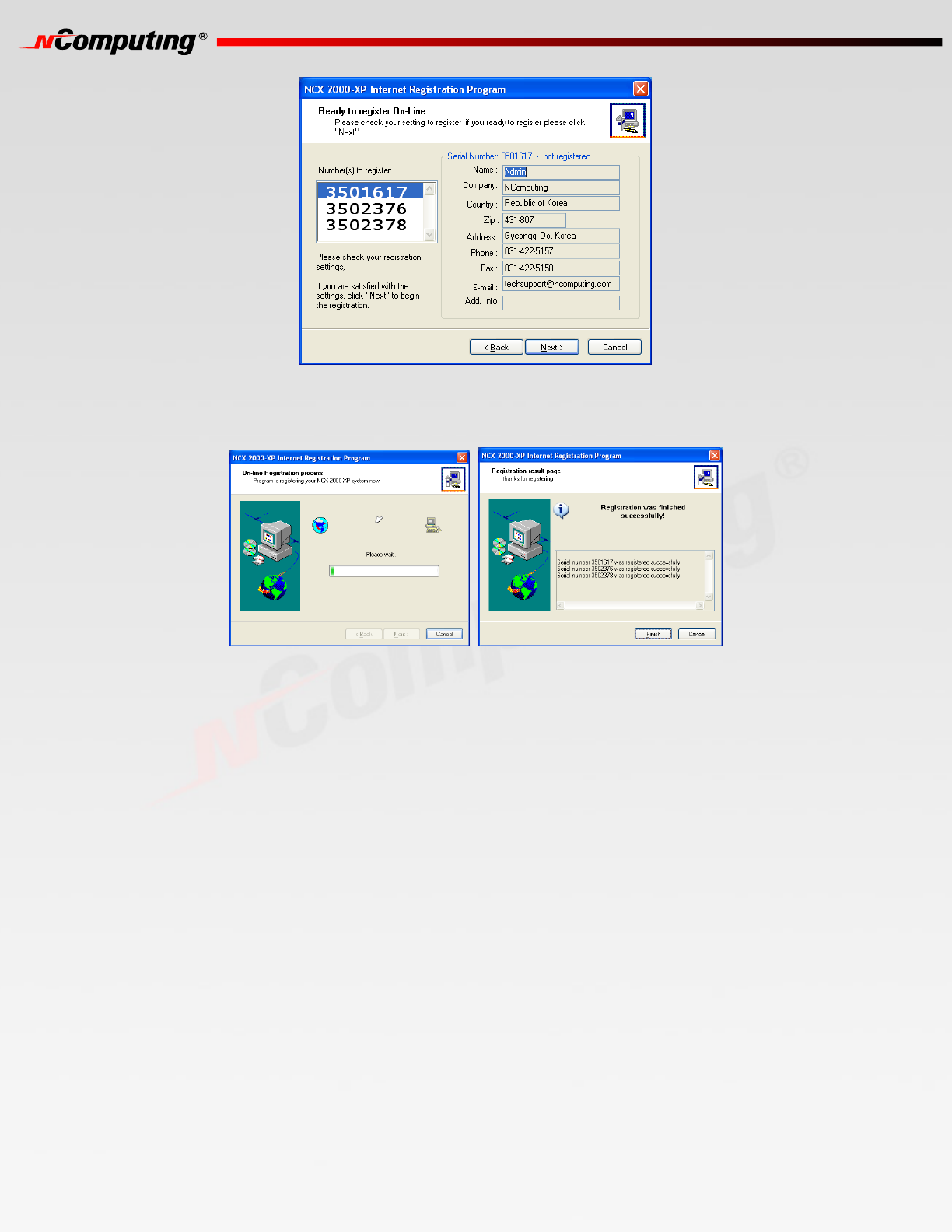 registration process is complete, the window shows the results of the process, including which serial