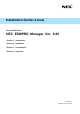 NEC ESMPRO Manager Ver. 6.00 Installation This chapter explains installation of NEC ESMPRO Manager. 1. Before Installation Describes about necessary setting before NEC ESMPRO Manager installation. 2. Installation Describes about installation procedure of NEC ESMPRO Manager. 3. After Installation Describes about necessary setting after NEC ESMPRO Manager installation.