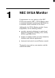 NEC SVGA Monitor Congratulations on your purchase of the NEC SVGA color monitor. NEC’s SVGA Monitor offers a maximum horizontal resolution of 1024 Pixels by a maximum vertical resolution of 768 Pixels. Additionally, the SVGA Monitor provides System compatibility via the following features: n provides automatic adjustment to vertical and horizontal frequencies including VGA, SVGA, EVGA, and VESA VGA. n displays an infinite number of colors (limited by hardware and Software applications).