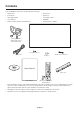 Contents Your new MultiSync monitor box* should contain the following: • LCD monitor • Cable Cover • Power Cord*1 • Clamp x 3 • Video Signal Cable • Screw (M4 x 10) x 9 • User’s Manual • CD-ROM • Wireless Remote Control and AA Batteries • Thumbscrew for stand x 2 Video Signal Cable (Mini D-SUB 15 pin to Mini D-SUB 15 pin) Screw (M4 x 10) x 9 Thumbscrew for stand x 2 Power Cord*1 Clamp x 3 User’s Manual CD-ROM Cable cover User’s Manual Wireless Remote Control and AA Batteries *1 Ty