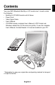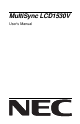 English Contents Your new NEC-Mitsubishi MultiSync LCD monitor box* should contain the following: • MultiSync LCD1530V monitor with tilt base • Power Cord • Video Signal Cable • User’s Manual • CD-ROM includes complete User‘s Manual in PDF format and Windows related files (Inf file and color profile). To see the complete User‘s Manual, Acrobat Reader 4.0 must be installed on your PC. * Remember to save your original box and packing material to transport or ship the monitor.