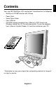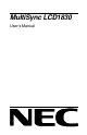 English Contents Your new NEC MultiSync LCD monitor box* should contain the following: • MultiSync LCD1830 monitor with tilt base • Power Cord • Video Signal Cable • User’s Manual • CD-ROM includes complete User‘s Manual in PDF format and Windows related files (Inf file and color profile). To see the complete User‘s Manual, Acrobat Reader 4.0 must be installed on your PC. * Remember to save your original box and packing material to transport or ship the monitor.