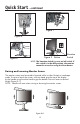 Quick Start – continued Remove Stand for Mounting The stand can be removed in order to mount the monitor using an alternate, VESA approved, mounting method. 1.Disconnect all cables. 2. With one hand, grip the top of the display by the handle using the other hand to grip the bottom. Raise the monitor up to the highest position (see Raising and Lowering Monitor Screen page 5). 3. Place monitor face down on a nonabrasive surface (Figure S.1). 4.
