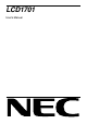 English Contents Your new NEC LCD monitor box* should contain the following: • LCD1701 monitor with tilt base • Power Cord • Video Signal Cable • User’s Manual • CD ROM (includes complete User’s Manual in PDF format). To see the User’s Manual, Acrobat Reader 4.0 must be installed on your PC. * Remember to save your original box and packing material to transport or ship the monitor. Quick Start To attach the LCD monitor to your system, follow these instructions: 1.
