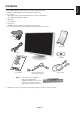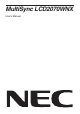 English Contents Your new NEC MultiSync LCD monitor box* should contain the following: • MultiSync LCD2070WNX monitor with tilt/swivel adjust stand • Power Cord • Video Signal Cable (15-pin mini D-SUB male to 15-pin mini D-SUB male) • Video Signal Cable (DVI-D to DVI-D) • USB Cable • User’s Manual • Cable Cover • CD ROM (includes complete User’s Manual in PDF format). To see the User’s Manual, Acrobat Reader 4.0 must be installed on your PC.