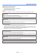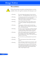 Usage Notice Precautions Follow all warnings, precautions and maintenance as recommended in this user’s guide to maximize the life of your unit. English ... 2 ■ Warning- Do not look into the projector’s lens when the lamp is on. The bright light may hurt your eyes. ■ Warning- To reduce the risk of fire or electric shock, do not expose this projector to rain or moisture. ■ Warning- Please do not open or disassemble the projector as this may cause electric shock.