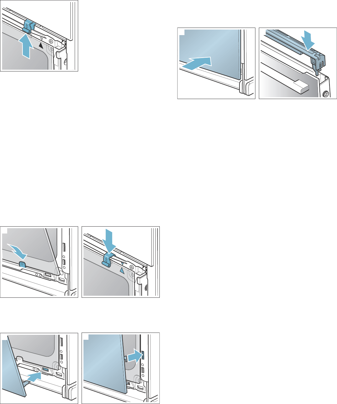 - 6. An der Zwischenscheibe oben die beiden Halterungen nach oben drücken, nicht abnehmen (Bild %). Halten Sie die Scheibe mit einer Hand fest. Scheibe herausnehmen.