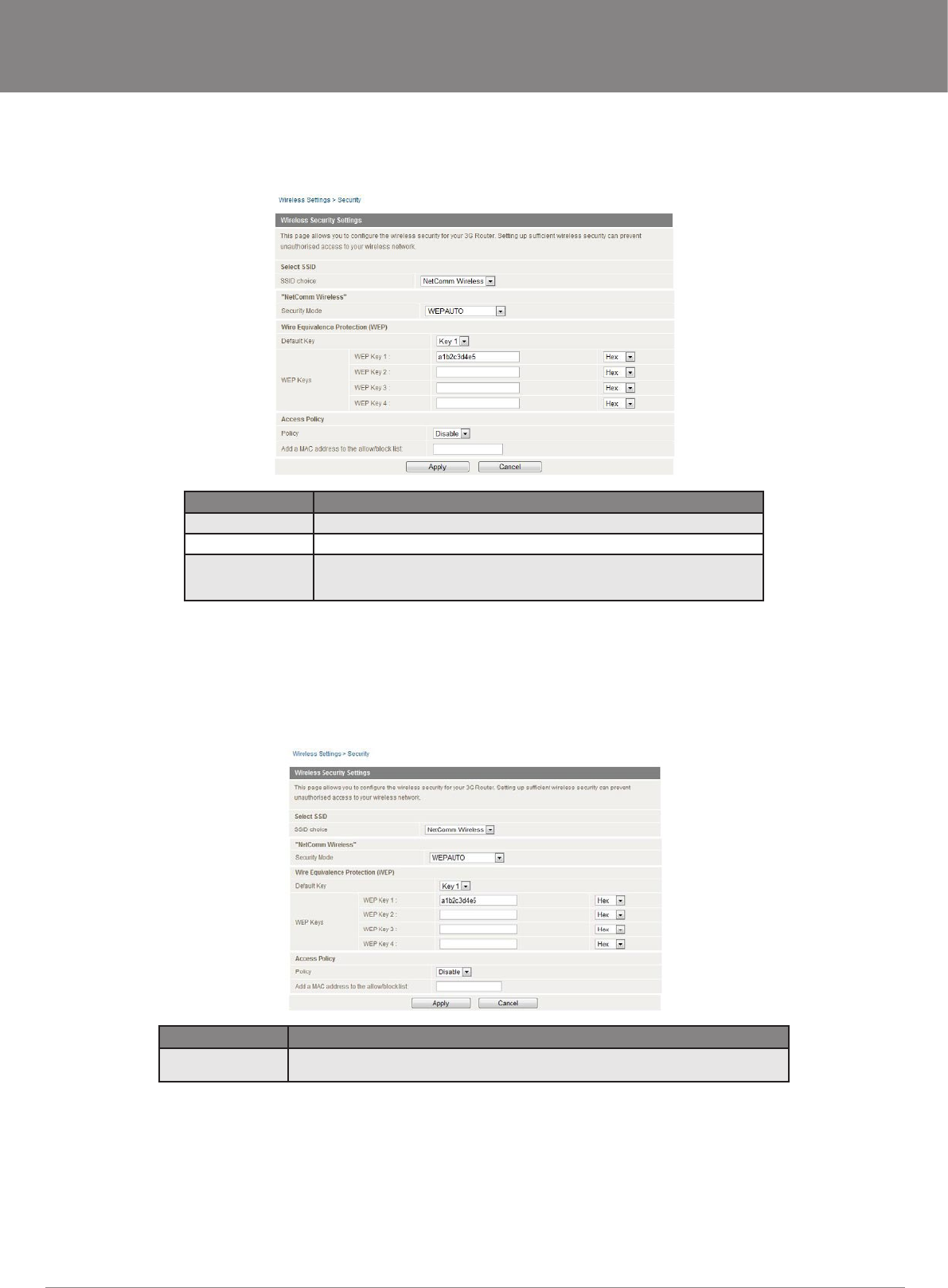 This page allows you to congure the wireless security for your 3G Router. Setting up sufcient wireless security can prevent unauthorised
