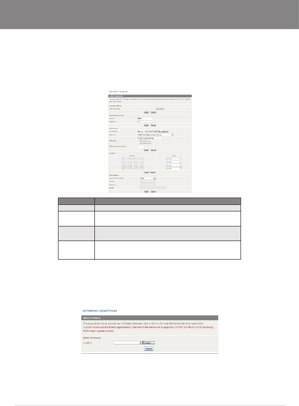 This page allows you to upgrade the Router’s rmware. To upgrade the rmware of your 3G Router, you need to download the rmware le