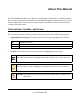 About This Manual The NETGEAR® RangeMax™ Duo Wireless-N USB Adapter WNDA3100 User Manual describes how to install, configure and troubleshoot the NETGEAR RangeMax Dual Band Wireless-N USB Adapter WNDA3100. The information in this manual is intended for readers with intermediate computer and Internet skills. Conventions, Formats, and Scope The conventions, formats, and scope of this manual are described in the following paragraphs: • • Typographical Conventions.