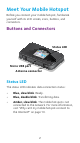 Meet Your Mobile Hotspot Before you connect your mobile hotspot, familiarize yourself with its LCD screen, icons, buttons, and connectors. Buttons and Connectors Status LED Micro USB port Antenna connector Status LED The status LED indicates data connection status: • • • Blue, slow blink. Ready. Blue, double blink. Transferring data. Amber, slow blink. The mobile hotspot is not connected to the network. For more information, visit “Why can’t my mobile hotspot connect to the Internet?” on page 13.