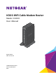 N300 WiFi Cable Modem Router Model C3000 Table 4. Technical specifications Technical Specifications (continued) Interface Local: 10BASE-T, 100/1000BASE-Tx, RJ-45 802.11n/g/b Internet: DOCSIS 3.0. Downward compatible with DOCSIS 2.0, 1.1 and 1.