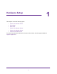 1. 1 Hardware Setup This chapter covers the following topics: • Unpack Your Modem Router • Front Panel • Rear Panel • Position Your Modem Router • Position Your Modem Router • Cable Your Modem Router For more information about the topics covered in this manual, visit the support website at support.netgear.com.