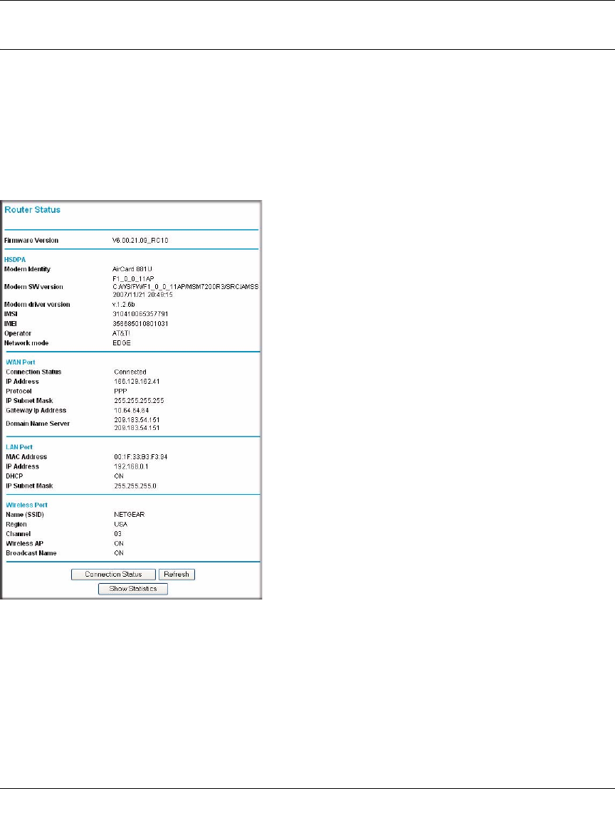 The Router Status screen provides status and usage information. This screen shows the following