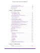 Contents Chapter 1 Hardware Setup Unpack Your Modem Router . . . . . . . . . . . . . . . . . . . . . . . . . . . . . . . . . . . . 8 Hardware Features. . . . . . . . . . . . . . . . . . . . . . . . . . . . . . . . . . . . . . . . . . . . 9 Front Panel . . . . . . . . . . . . . . . . . . . . . . . . . . . . . . . . . . . . . . . . . . . . . . . . 9 Back Panel . . . . . . . . . . . . . . . . . . . . . . . . . . . . . . . . . . . . . . . . . . . . . . . 11 Side Panel with Restore Factory Settings Button. . .