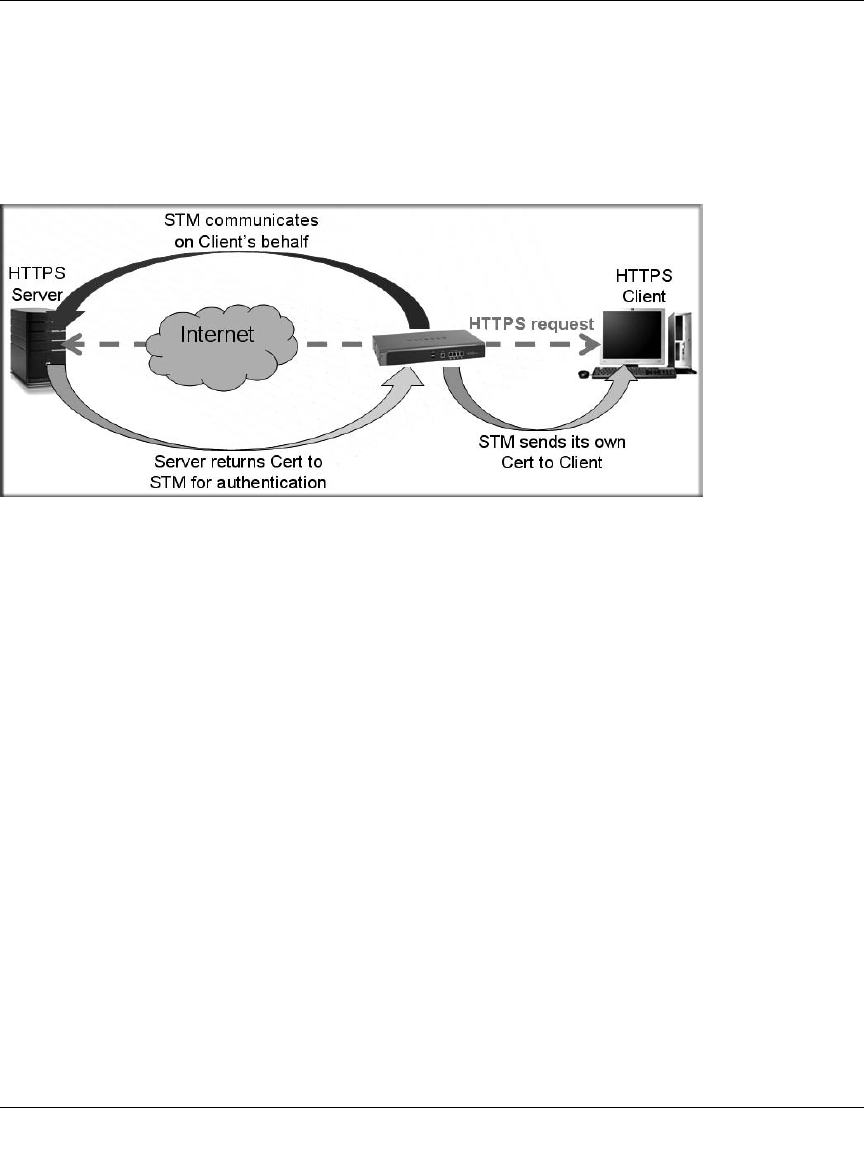 • The STM breaks up an SSL connection between an HTTPS server and an HTTP client in two
