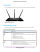 Nighthawk AC2300 Smart WLAN-Router Tabelle 1: Beschreibung der LEDs (Fortsetzung) LED Beschreibung WLAN-Ein-/Aus-Schalter mit Durch Drücken dieser Taste für zwei Sekunden wird das WLAN im 2,4-GHz-Bereich und 5-GHz-Bereich ein- und ausgeschaltet. LED Wenn diese LED leuchtet, ist dasWLAN aktiviert. Wenn diese LED nicht leuchtet, ist dasWLAN deaktiviert, und Sie können keine WLAN-Verbindung mit dem Router herstellen.