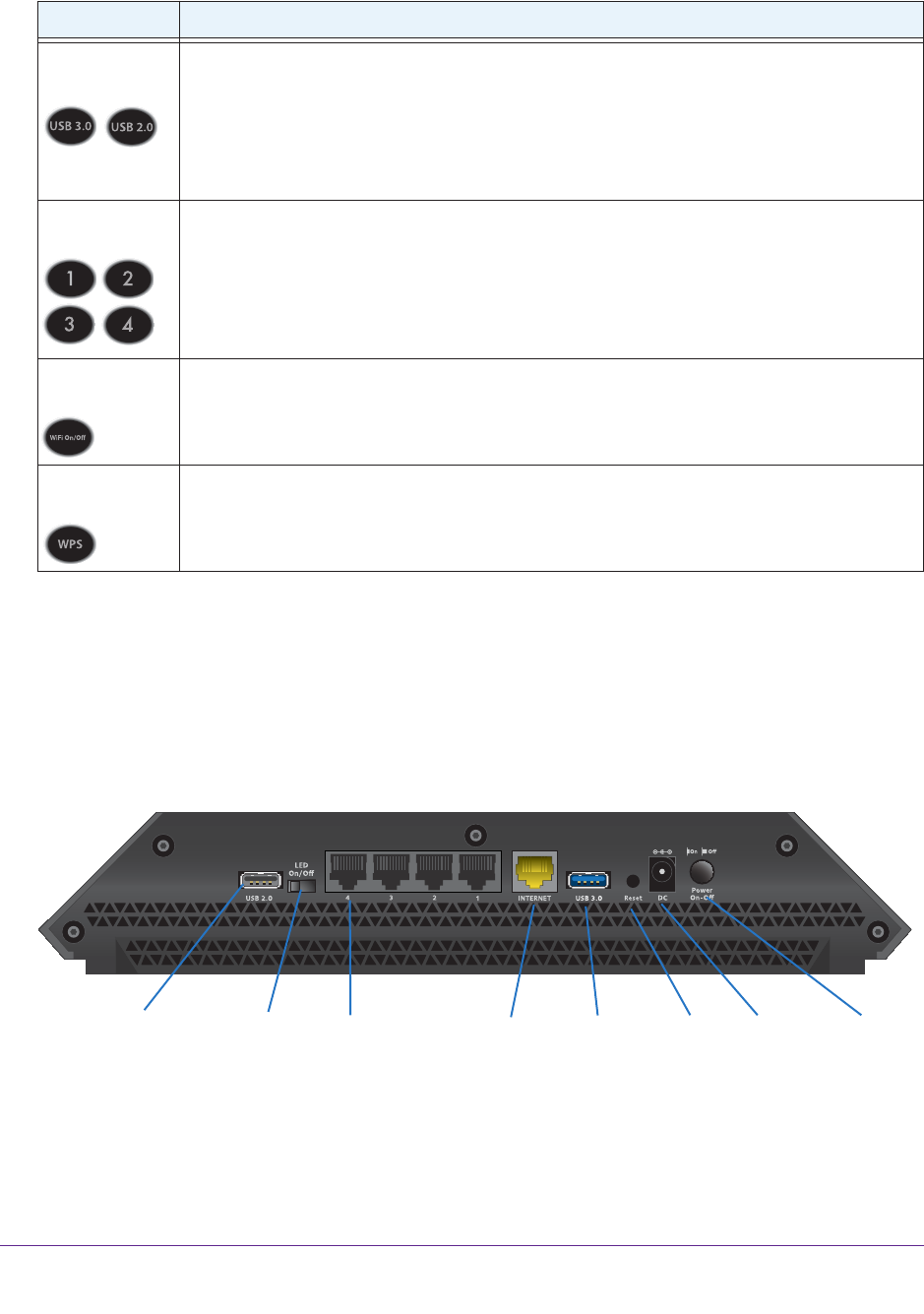 Pressing this button for two seconds turns the 2.4 GHz and 5 GHz WiFi radios on and off.