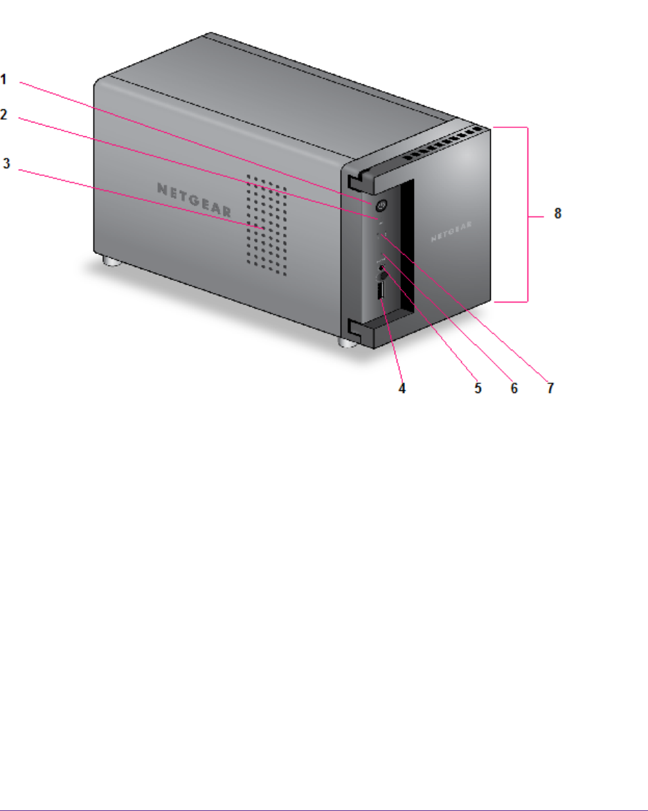 The following figure shows the front and side panels of the ReadyNAS 102.