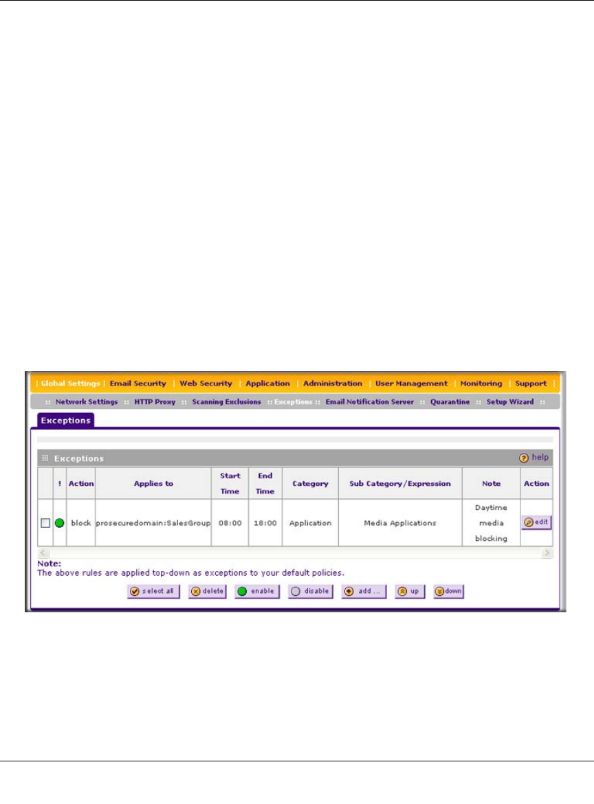 1. Select Global Settings > Exceptions from the menu. The Exceptions screen displays. This