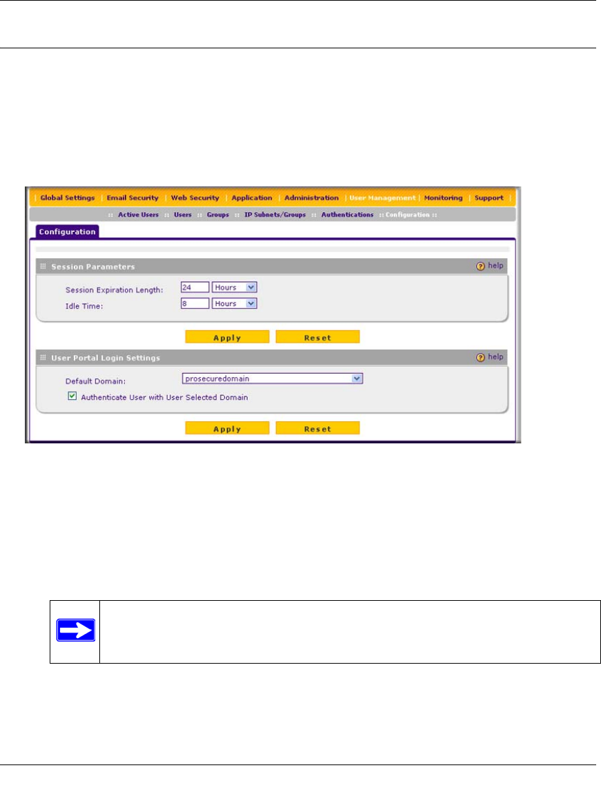 session expiration period, the allowed session idle time, and the default domain that is presented to