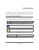 About This Manual The NETGEAR® Prosafe™ SSL VPN Concentrator 25 SSL312 Reference Manual describes how to install, configure and troubleshoot the NETGEAR 108 Mbps Wireless PC Card WG511T. The information in this manual is intended for readers with intermediate computer and Internet skills. Conventions, Formats and Scope The conventions, formats, and scope of this manual are described in the following paragraphs: • • Typographical Conventions.