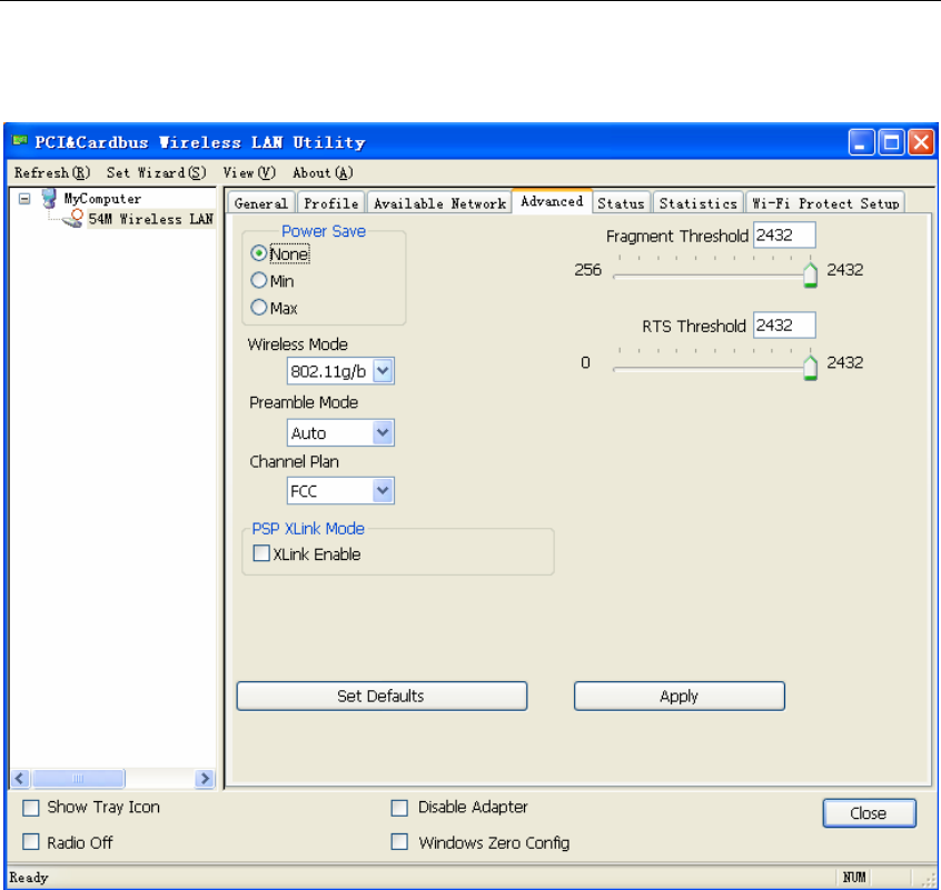 Specify that the adapter work in an access point network with 802.11g/b or 802.11g operation.