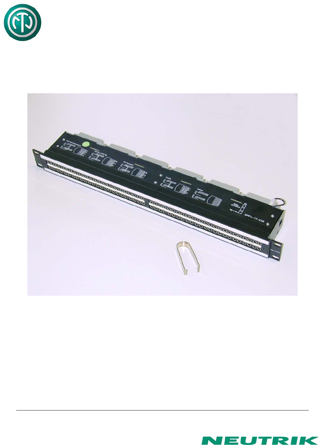 NPPA-TT-E56 Instruction Manual 1. Electrical configuration The Neutrik ”Easy Patch” Patch Panel is fitted with high quality, long life NJ3TTA gold plated double contact jacks (2 x 48). This Patch Panel is an innovative and compact patching system (just 1 U high) for 19” rack mounting. Robustly housed in black coated steel shell and featuring precision aluminum fittings it is built to last. The Neutrik "Easy Patch” is suitable for analog and digital audio signals.
