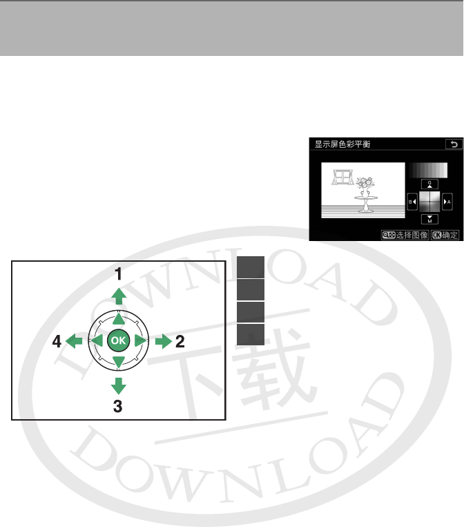 显示屏色彩平衡仅应用至菜单、播放及拍摄显示;使用照相机所拍摄