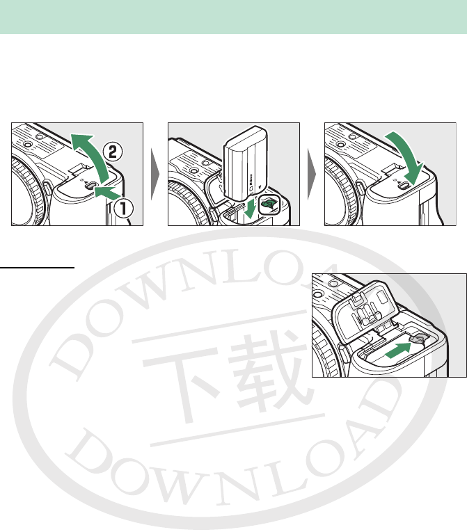 盖。如箭头所示方向按电池锁闩以释放电池,
