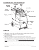 GET FAMILIAR WITH YOUR NEW EXTRACTOR Dump Hose Recovery Tank Lid Vaccum inlet to tank Switch Plate Solution Hose Connection Solution Tank Lid Recovery Tank Vacuum Hose Cuff Solution Tank Wheel Latch Castor OPERATION 1 Inspect the machine, hoses, and cleaning tools for cleanliness and completeness. 2 Fill the solution tank with water. Using warm water may be a benefit in cleaning effectiveness, but do not use hot water (above 54°C / 130° F) in the tank. 3 Plug in the power cord.