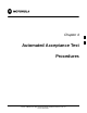 Automated Acceptance Test Procedure - Introduction 68P09255A69-3 Automated Acceptance Test Procedure - Introduction Introduction General The Acceptance Test Procedures (ATP) allow Cellular Field Engineers (CFEs) to run automated acceptance tests on all BTS subsystem devices equipped in the CDF using the LMF and the test equipment it supports. Test Reports The CFE can choose to save the results of ATP tests to a report file from which ATP reports are generated for later printing.