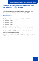 About the Expansion Module for IP Phone 1100 Series About the Expansion Module for IP Phone 1100 Series This document describes the Expansion Module for IP Phone 1100 Series (Expansion Module) and how to use it with the IP Phone. Description The Expansion Module is supported on the following IP Phones: • IP Phone 1120E • IP Phone 1140E • IP Phone 1150E The Expansion Module is a hardware accessory that connects to the IP Phone and provides additional line appearances and feature keys.