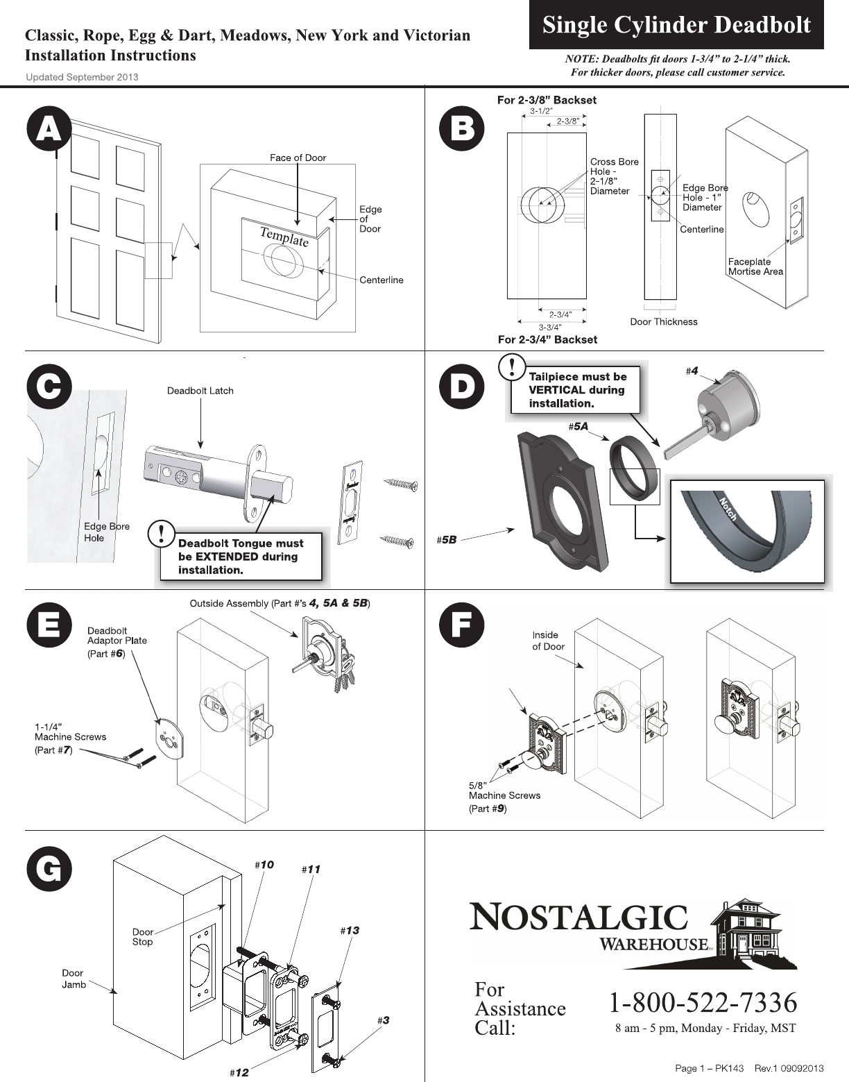 Classic, Rope, Egg & Dart, Meadows, New York and Victorian ST Cylinder Deadbolt Installation Instructions Punctuated September 2043 NOTE: Deadbolts fit doors to thick. For thicker doors, please call customer service. Face of Dewar For Backs st (32 > < 238) Hole a Dis meter Door Thickness For Backseat Deadbolt Latch Deadbolt Tungus must be EXTENDED during Installation. Tailpiece must be VERTICAL during Installation. NOSTALGIC WAREHOUSE. For acne 1-800-522-7336 Call: Monday Friday, MST Page 1PK143 Rev.
