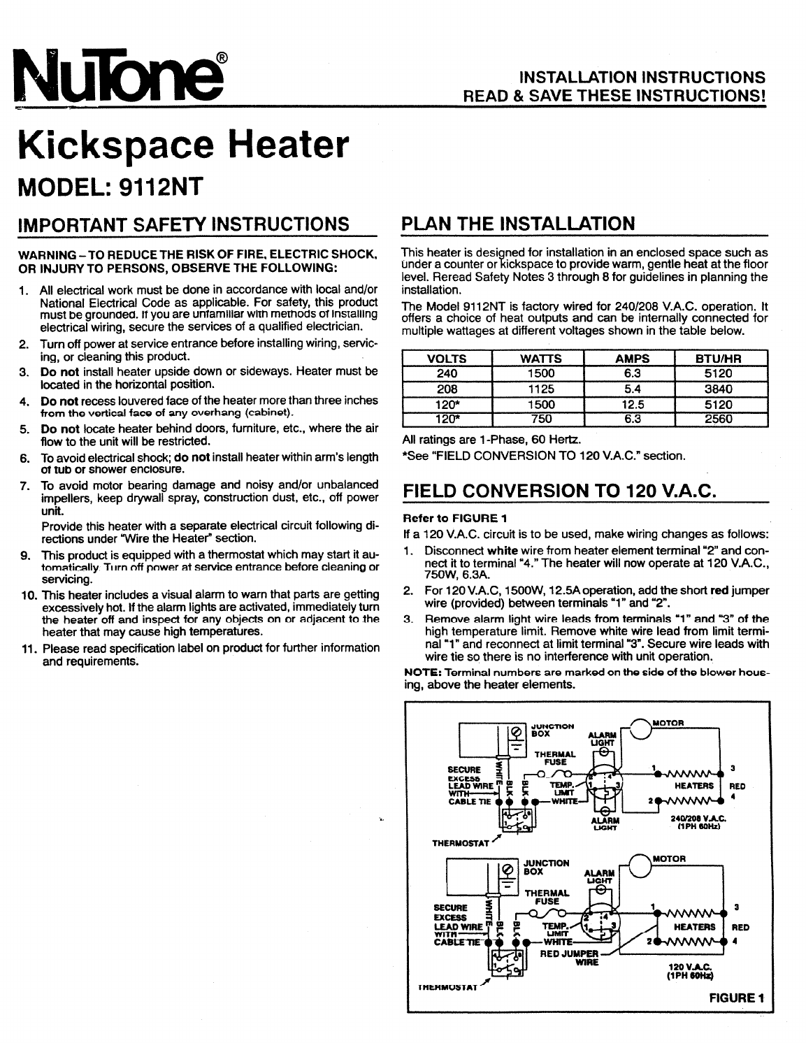 Nu lone Kick space Heater MODEL: 9112NT IMPORTANT SAFETY INSTRUCTIONS WARNING TO REDUCE THE RISK OF FIRE, ELECTRIC SHOCK, OR INJURY TO PERSONS, OBSERVE THE FOLLOWING: 1. Al electrical work must be done in accordance with local and for National Electrical Code as applicable. For safety, this product must be grounded. Hf you are unfamiliar with methods of installing electrical wiring, secure the services of a qualified electrician. 2.
