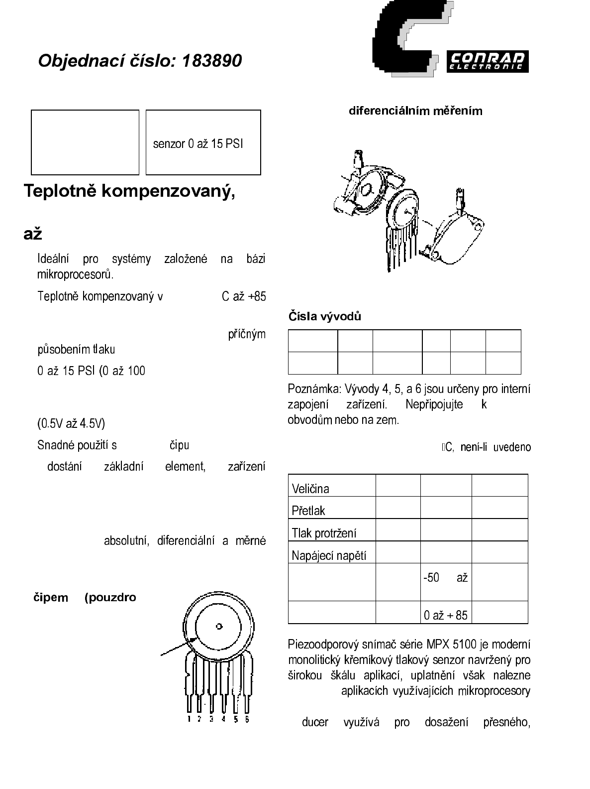 Motorola Semiconductor 2EMHGQDFt þtVOR Technické údaje Varianta s GLIHUHQFLiOQtP P HQtP Silikonový tlakový Série MPX 5100 7HSORWQ Vakuová strana VHQ]RU Då 36, Strana s pozitivním tlakem NRPSHQ]RYDQê kalibrovaný výstup 0.5V Då 4.