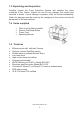 1.3 Unpacking and Inspection Carefully unpack the Fume Extraction System and examine the items contained in the Carton. Inspect the unit for any damage that might have occurred in transit. If such damage is present, notify the carrier immediately. Claims for damage must be made by the consignee to the carrier and should be reported to the manufacturer. 1.4 Items supplied 1 1 1 1 Filter Unit with filters installed Remote Start/Stop Button Power Cord Operating Manual 1.