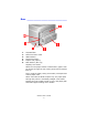 Rear ____________________________ c51_01_backview.jpg 1. 2. 3. 4. 5. 6. On/Off Switch Socket for Power Cord USB Interface Network Interface Duplex Unit (option) Rear Stacker (face up) Capacity 100 sheets When the rear paper stacker is folded down, paper exits the printer through the rear of the printer and is stacked face up. This is used for labels, heavy print media, envelopes and custom paper sizes. When used with the Multi-Purpose Tray, the paper path through the printer is essentially straight.