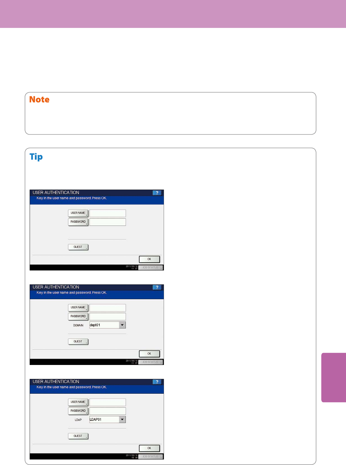 If a guest user is enabled in the user management function, [GUEST] is displayed on the touch panel. Press [GUEST] to log in as a guest