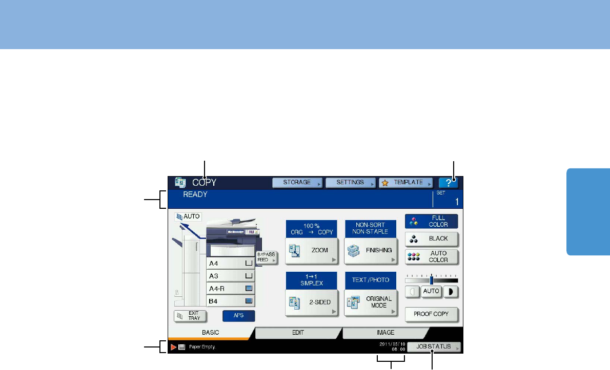 When the power is turned ON, the basic menu for copying functions is displayed on this touch panel. The status of the