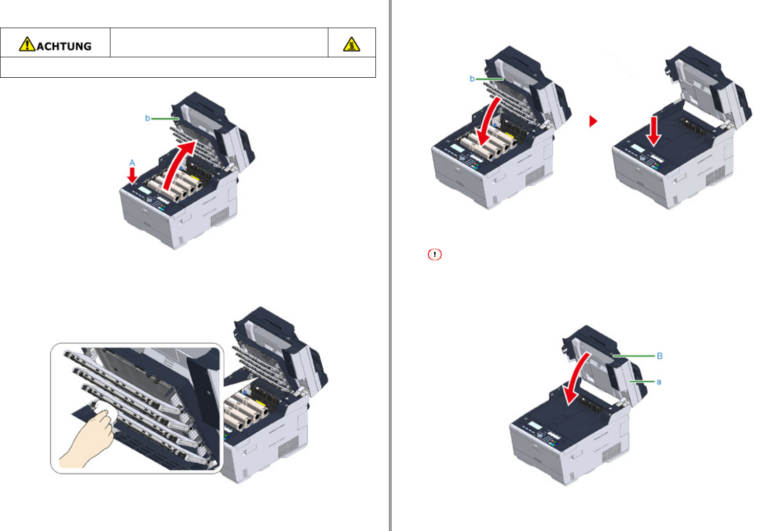 Drücken Sie die Taste (A) und öffnen Sie das Ausgabefach (b) vollständig.