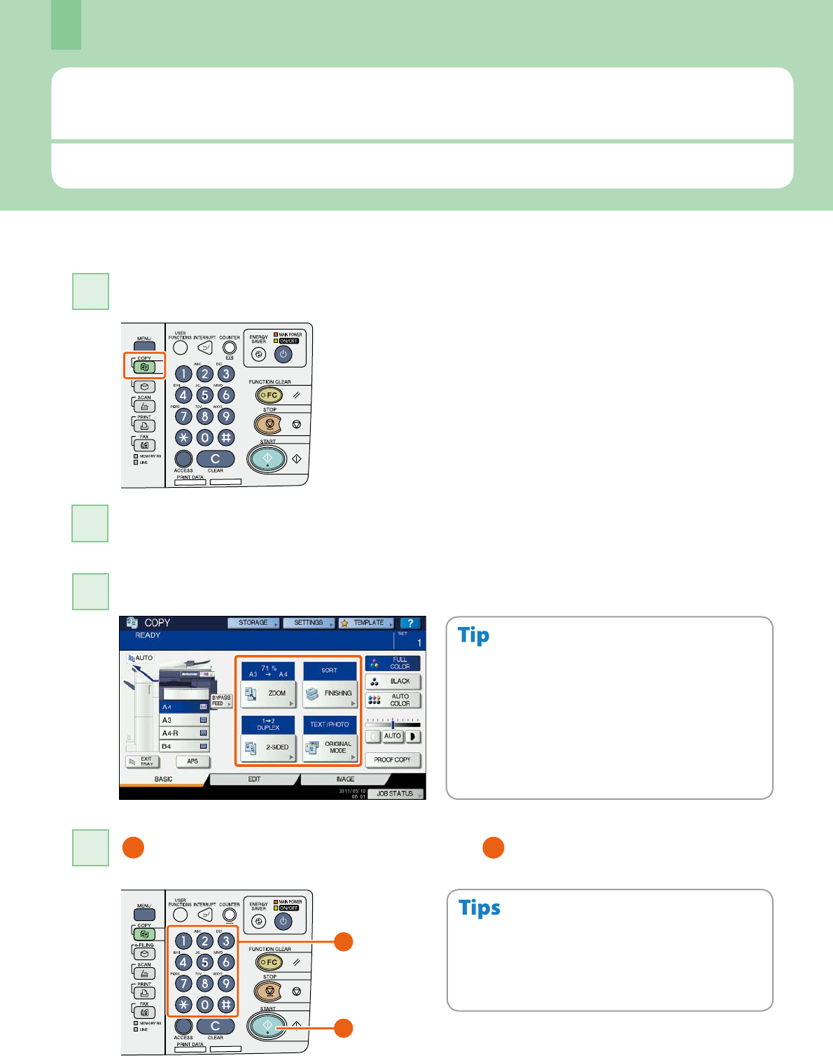 The basic copying procedures, such as enlargement/reduction copying and duplex copying as well as bypass copying, are as