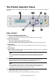 The Printer Operator Panel The operator panel consists of an LCD display, a menu-driven control panel and two LED indicators. PANEL ELEMENTS 1 Liquid crystal display (LCD) panel • Two rows of up to 16 alphanumeric digits. • Displays print status, menu items in menu mode and error messages. 2 Menu Scroll Buttons. • Press and release to enter the Menu mode. • Press and release again to select the next menu. • Press and hold for more than 2 seconds to scroll through the different menus.