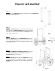 Popcorn Cart Assembly STEP 1: Screw one of the RUBBER FEET (A) into the bottom of each SUPPORT LEG (B). Tighten both rubber feet. STEP 2: Insert one WHEEL BOLT (O) into the bottom holes located on each side of the SUPPORT STAND (C). NOTE: Insert bolt from the inside out. Secure wheel bolts with one NUT (Q) on each side. Tighten with wrench. STEP 3: Hang one WHEEL (D) onto one WHEEL BOLT (O) and secure with one NYLOC NUT (P). Tighten with wrench. Repeat step for second wheel. Note: Do not overtighten.