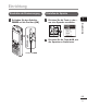 Einsetzen/Entnehmen einer microSD-Karte Der Voice Rekorder ist mit einem internen Speicher ausgestattet und unterstützt zudem separat erhältliche microSD-Karten (microSD, microSDHC). 1 Einsetzen einer microSD-Karte Erste Schritte 1 2 Öffnen Sie den Kartenfachdeckel, während sich der Voice Rekorder im Stoppmodus befindet. 3 Schließen Sie den Kartenfachdeckel. • Nach dem Einlegen der microSDKarte wird der Auswahlbildschirm für das Aufnahmemedium angezeigt.