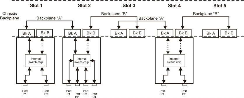 Figure 3 illustrates the connectivity of Backplane A and Backplane B when multiple modules are installed in the chassis. Modules