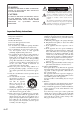 Precautions 1. Recording Copyright—Unless it’s for personal use only, recording copyrighted material is illegal without the permission of the copyright holder. 2. AC Fuse—The AC fuse inside the unit is not userserviceable. If you cannot turn on the unit, contact your Onkyo dealer. 3. Care—Occasionally you should dust the unit all over with a soft cloth. For stubborn stains, use a soft cloth dampened with a weak solution of mild detergent and water. Dry the unit immediately afterwards with a clean cloth.