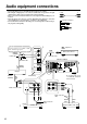 Connecting an equalizer The AMP IN and the PREOUT FRONT connectors are attached with jumper plugs. When connecting an equalizer, remove these jumper plugs before connecting the audio connection cables. TX-DS777 L R DIGITAL INPUT R L V (TX-DS777) FRONT SPEAKERS A SURROUND SPEAKERS S AMP IN OUT FRONT COAXIAL 1 ANTENNA VIDEO-1 PRE OUT R IN FRONT COAXIAL 2 L R 1. Remove the jumper plugs. See “Connecting power amplifiers.