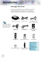 Introduction Package Overview Unpack and inspect the box contents to ensure all parts listed below are in the box. If something is missing, please contact Optoma customer service. POWER LAMP STANDBY TEMP Note ote Projector with lens cap Power Cord 1.8m Composite Video Cable 1.8m (Not Available in European Version) Due to different applications in each Country, some regions may have different accessories. VGA Cable 2.0m (Europe Only) HDMI Cable 2.